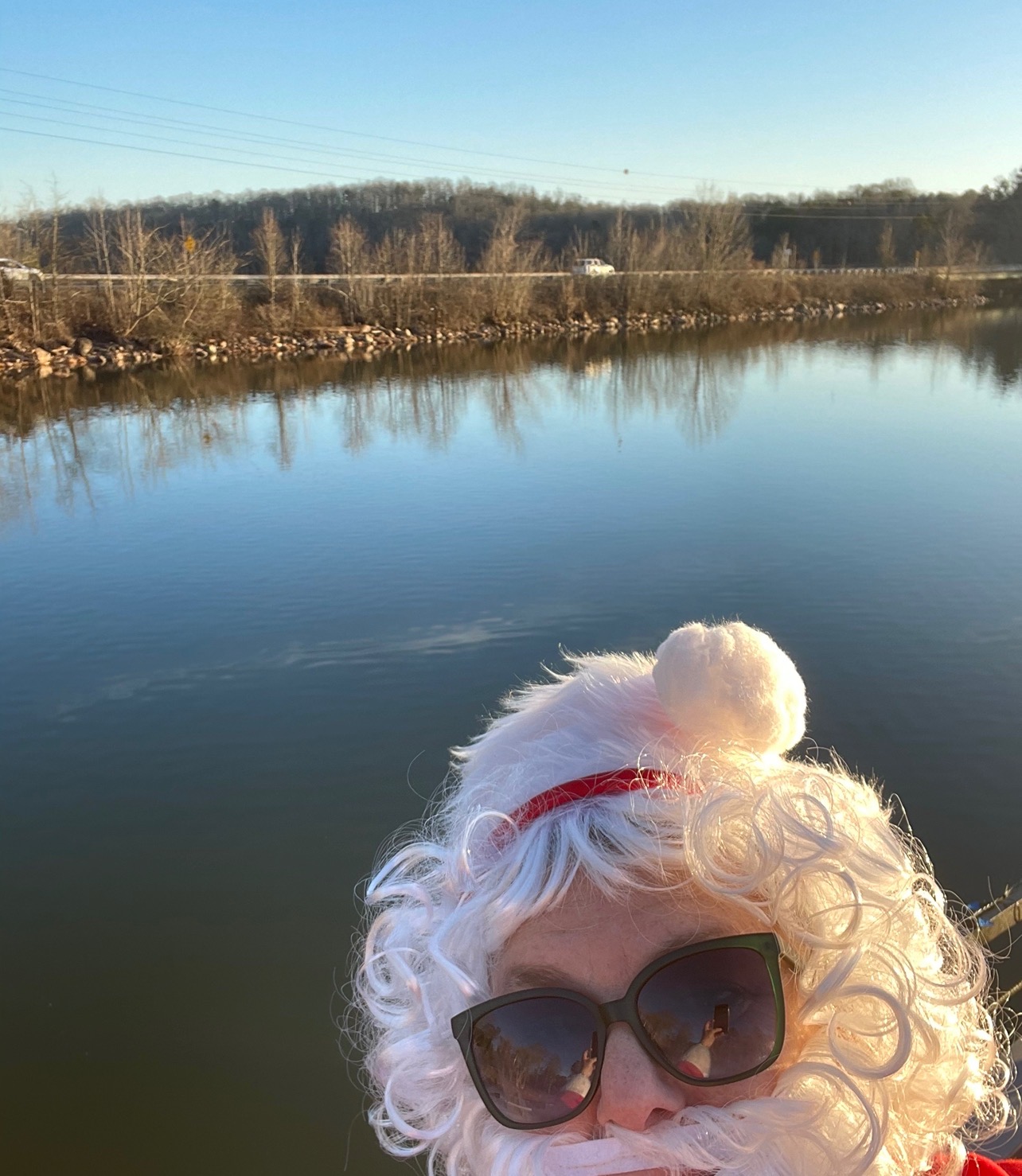 My favorite day was about a week into December. I was tired, and ready to call it quits for the afternoon. I went to my speaker and turned off my music. In the sudden quietness, I heard a tiny voice yelling “HEY SANTA!” The way sound travels on water…it took me a second to find where the little voice was coming from. I finally saw a family of people several docks down, waving their arms high in the air. I saw the tiny human that was no doubt yelling at me. There was no way I could just wave back and then leave. They were watching. That tiny little human was watching. I cranked my speaker back up and started right back dancing. And danced and danced until I saw them walking up the hill back towards their house…still waving. There were several of them…a pretty big family. And apparently, I was mistaken when I thought I saw all of them heading towards the house. As I once again went to stop my music, thinking that I could now stop for the day, I glanced back at their dock once more. Coming my way were two people in a paddle boat. All bundled up, fighting the afternoon winds, heading my way. A mother and a tiny little boy. The mother paddled hard, as the little boy’s legs weren’t long enough to help much. They made it over to the dock as I stood there and waved. And then I suddenly realized that I might be about to ruin Santa for this child. Did he think I was really Santa? I remembered my own child at that age…believing with all her heart in Santa and his wonderfulness. When this little boy got close to me and saw me and heard my voice, was I going to ruin his belief? I wanted this to be something amazing for him, not the letdown of just realizing he had been watching a crazy woman with bad dance moves impersonate the guy in the bright red suit.
